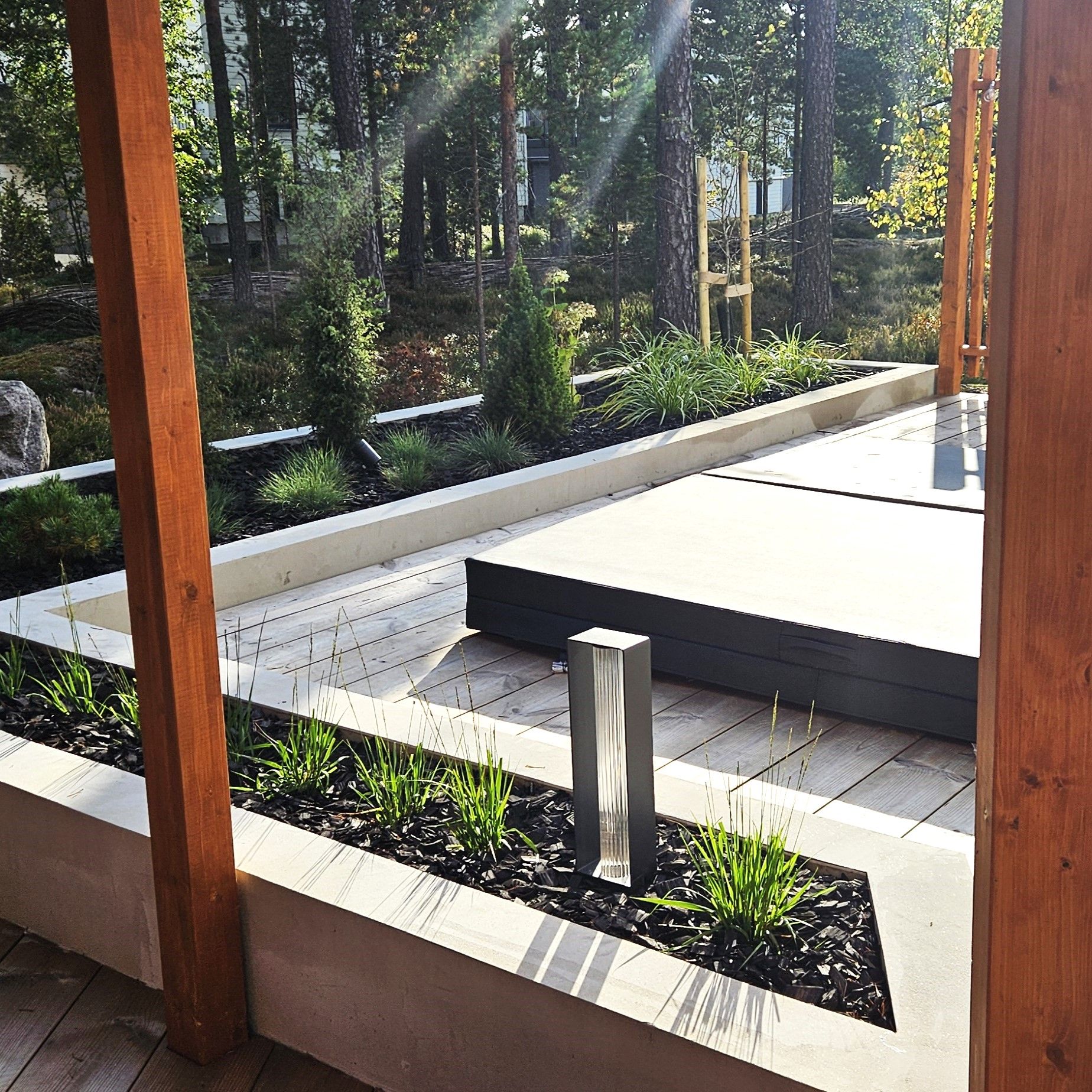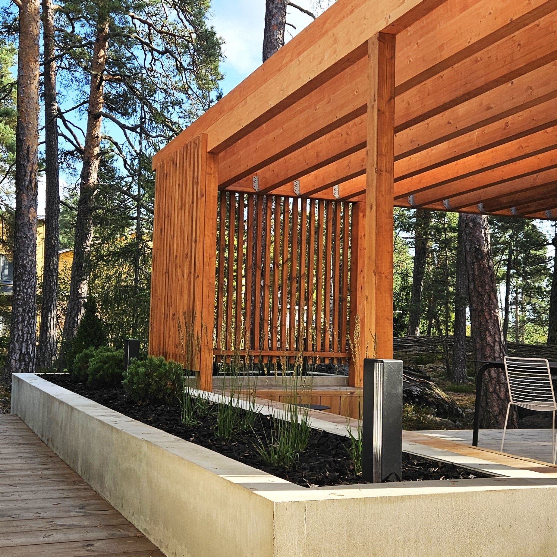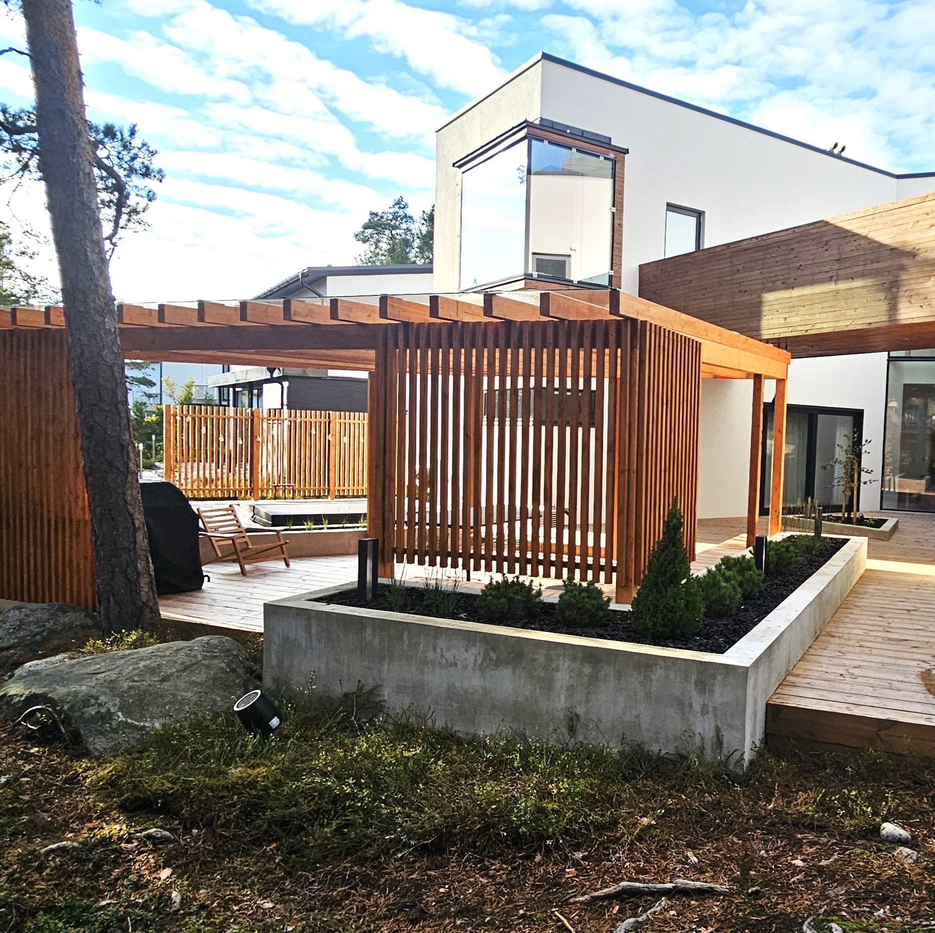 Kodin ikkunoista avautuu näkymä suojaisalle metsikköön rajautuvalle pihalle. Pihan saneerauksessa pääpainona toimi pihan käytettävyyden lisääminen. Selkeälinjaiset betonivaluiset istutusaltaat rajaavat erilaisia tiloja ja lisäävät näyttävyyttä terassialueille. Terassi jakaantuu nyt useampaan käytettävään alueeseen ja ikkunanäkymät ovat kiinnostavia ympäri vuoden.