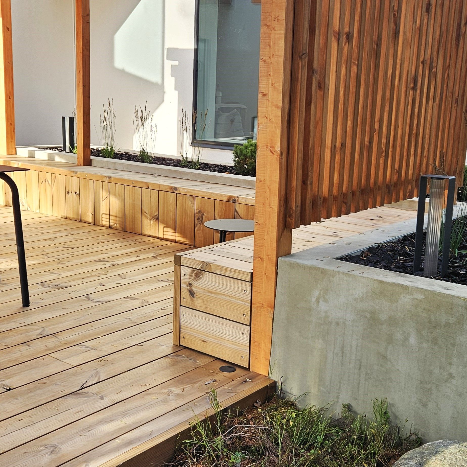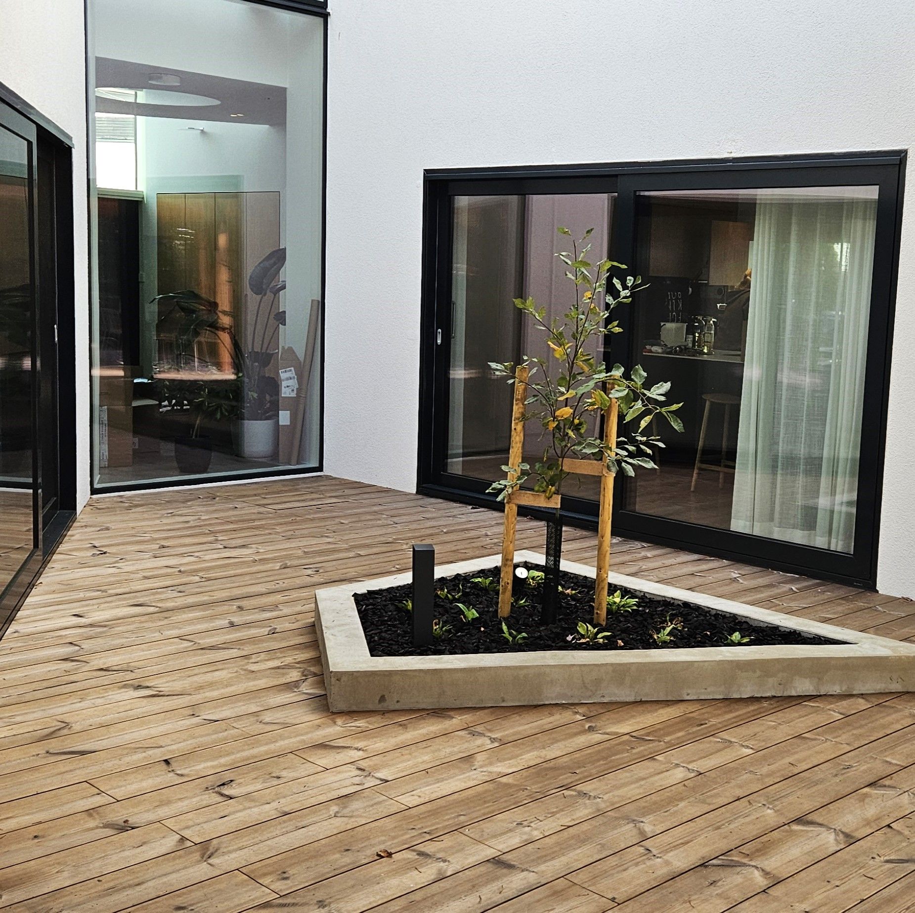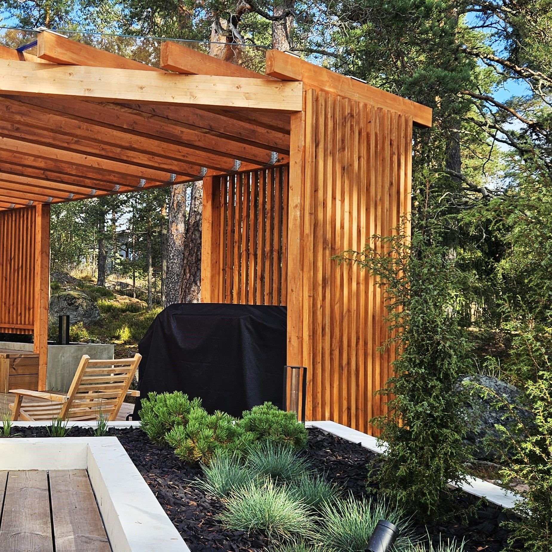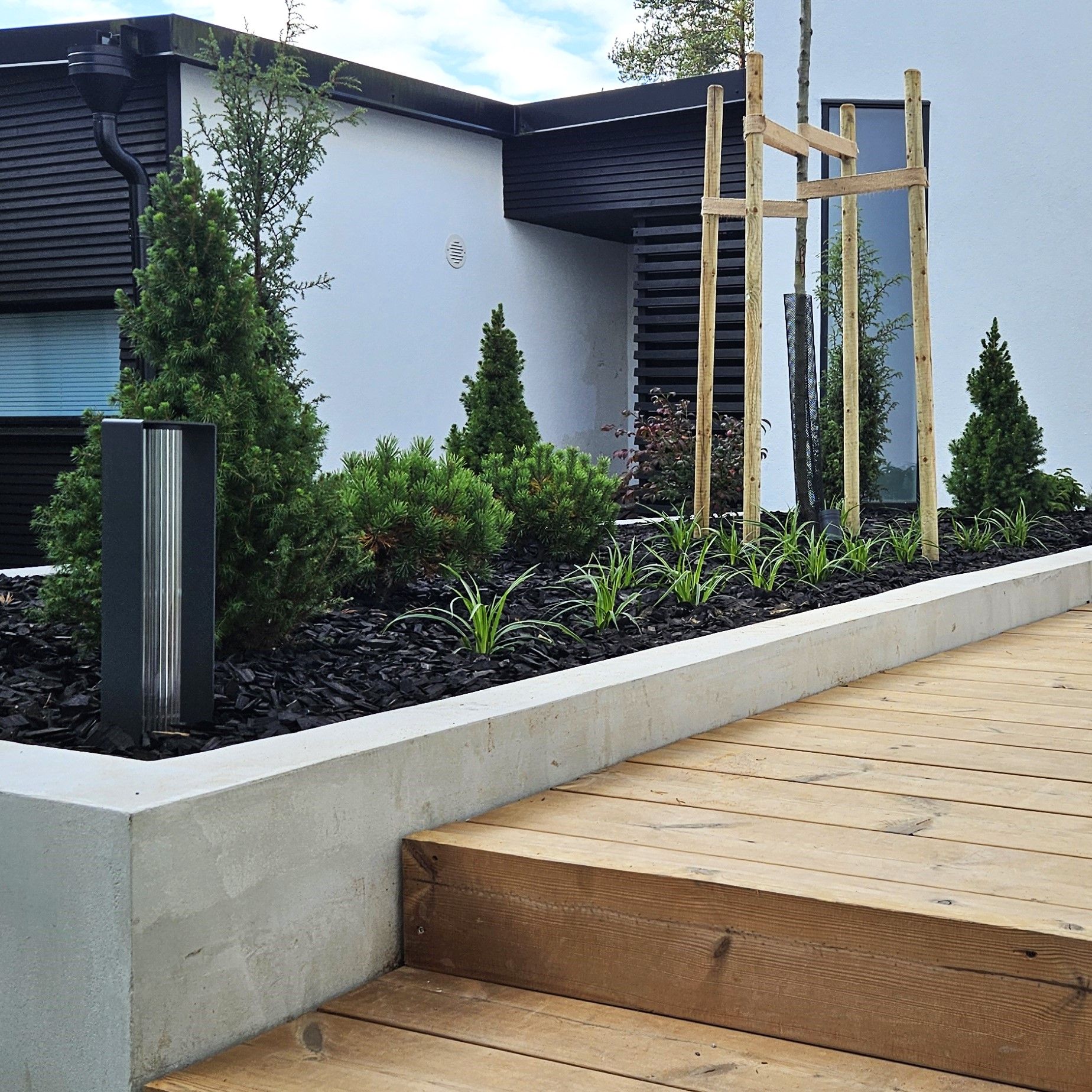 Kodin ikkunoista avautuu näkymä suojaisalle metsikköön rajautuvalle pihalle. Pihan saneerauksessa pääpainona toimi pihan käytettävyyden lisääminen. Selkeälinjaiset betonivaluiset istutusaltaat rajaavat erilaisia tiloja ja lisäävät näyttävyyttä terassialueille. Terassi jakaantuu nyt useampaan käytettävään alueeseen ja ikkunanäkymät ovat kiinnostavia ympäri vuoden.